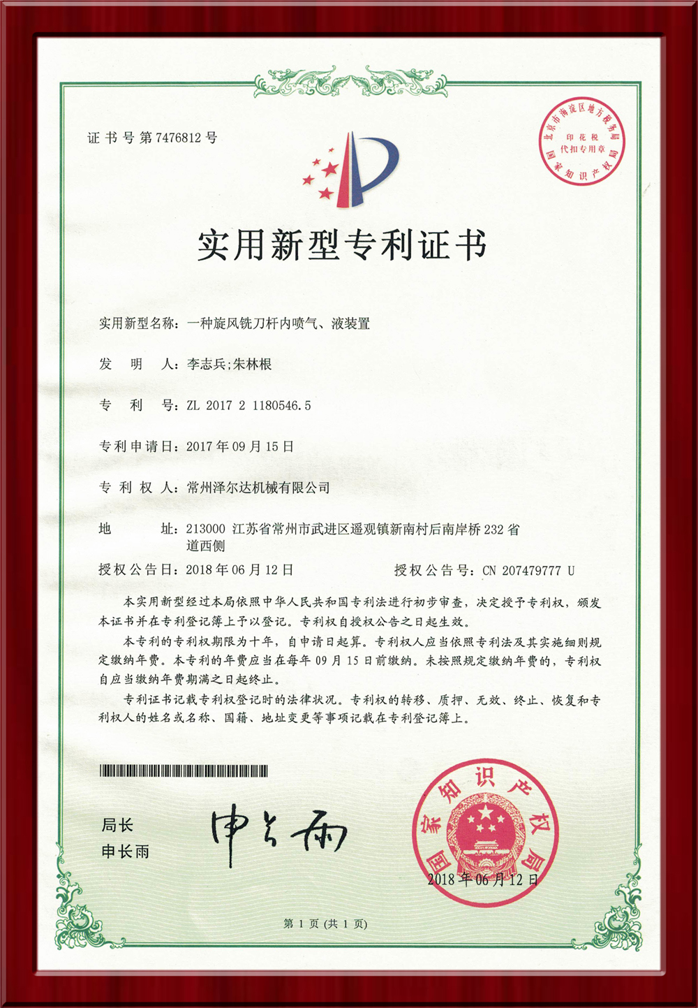 • 7476812實(shí)用新型專利